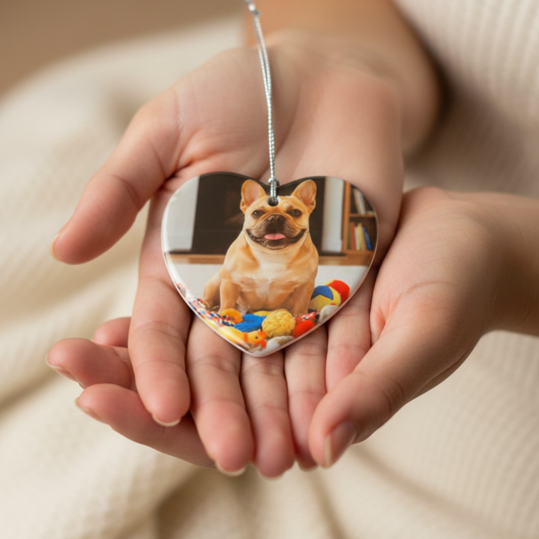 Verras jezelf of een dierbare met een hartvormig ornament (8 cm) bedrukt met een eigen foto en/of korte tekst. Dit ornamentje is gemaakt van keramiek en kan aan 1 kant bedrukt worden.